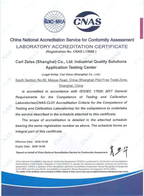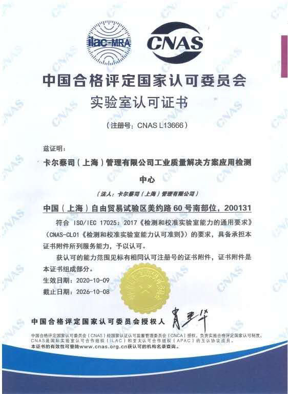 近日,卡尔宜宾蔡司(上海)管理有限公司工业质量解决方案应用检测中心经过中国合格评定国家认可委员会(CNAS)严格的现场评审和后续考察,正式通过了最终审评并获得实验室国家认可证书。至此,标志着蔡司应用检测中心具有了国家及国际认可的管理水平和校准能力。